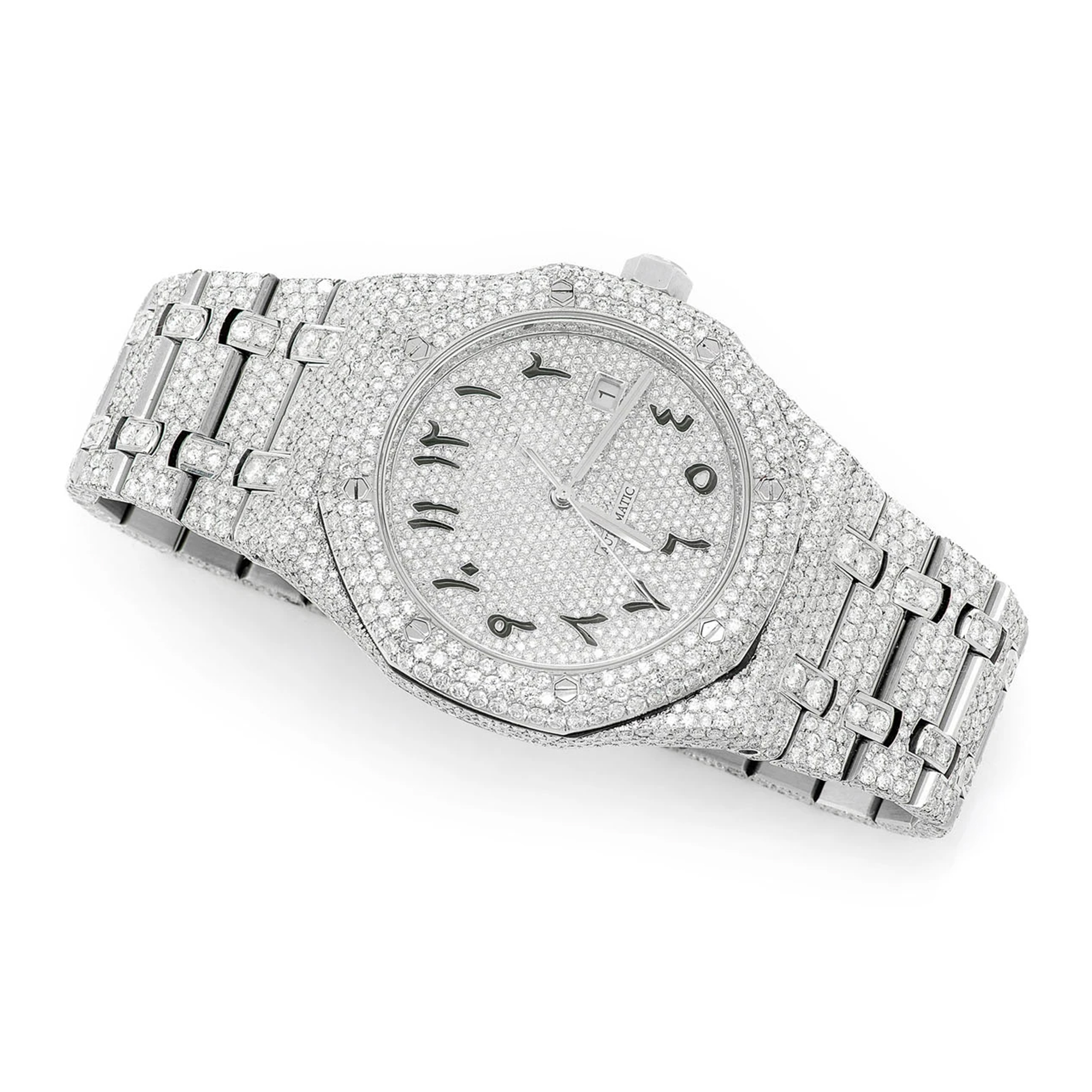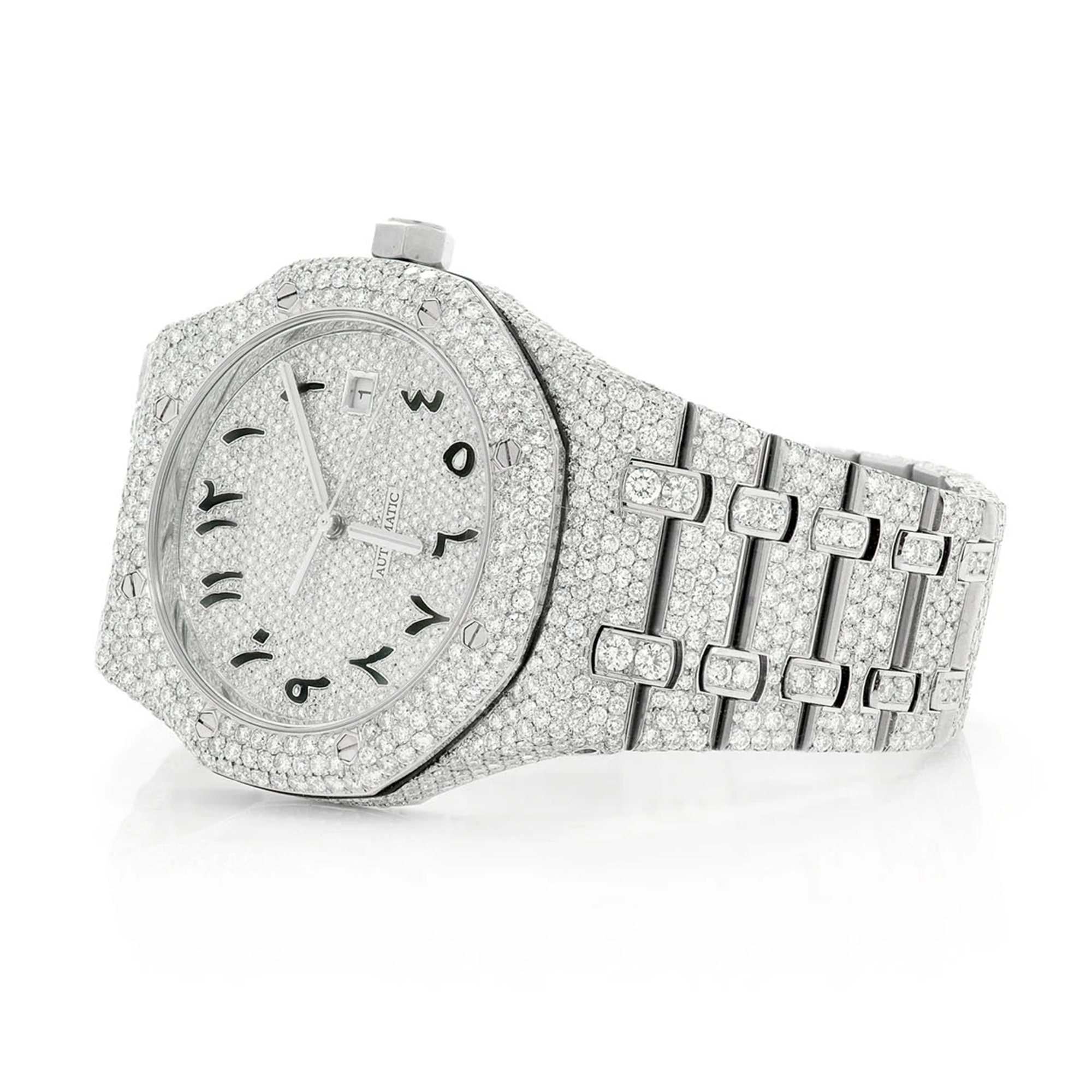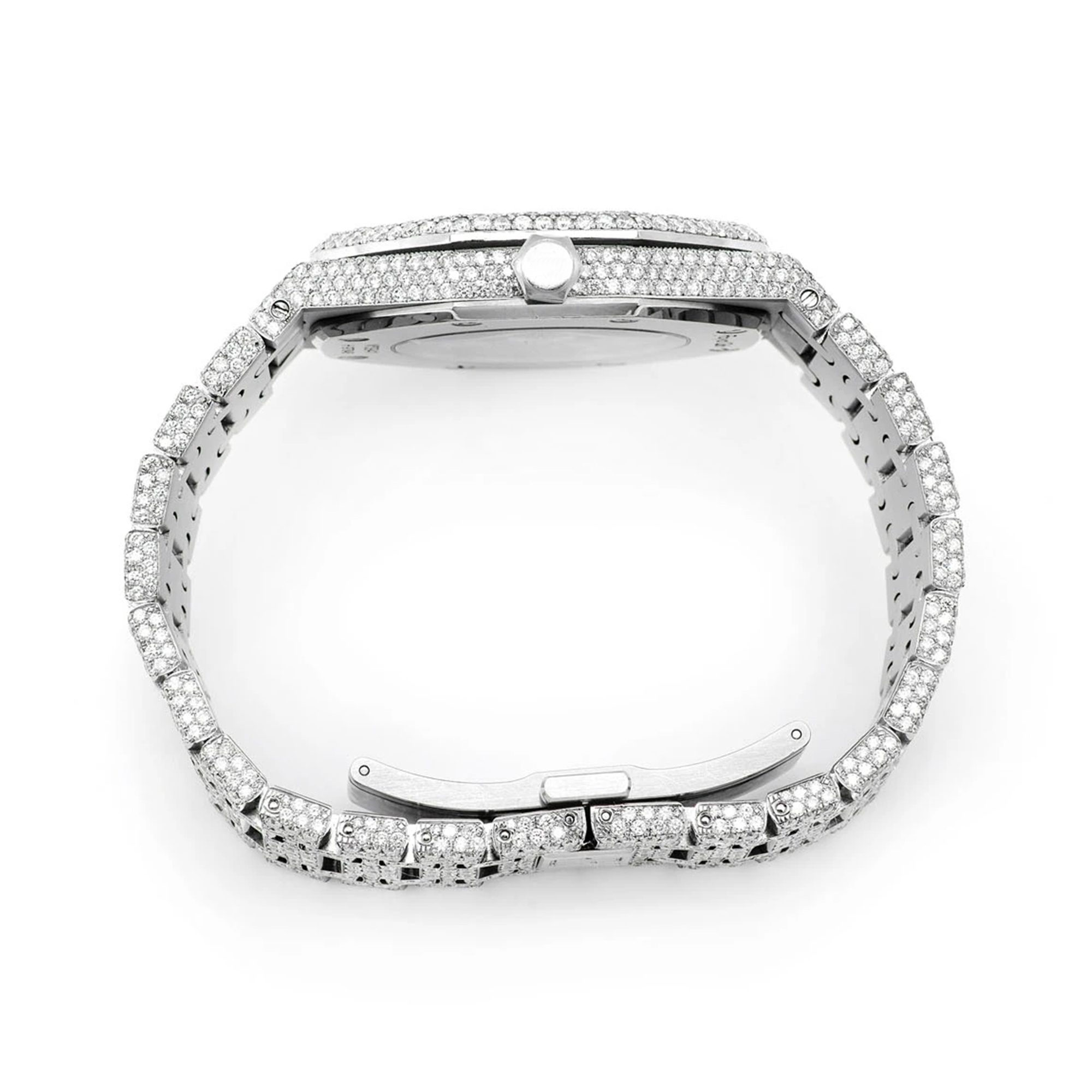 Our watches are encrusted with high-quality lab-created Moissanite stones, known for their diamond-like brilliance. They pass standard diamond testers.